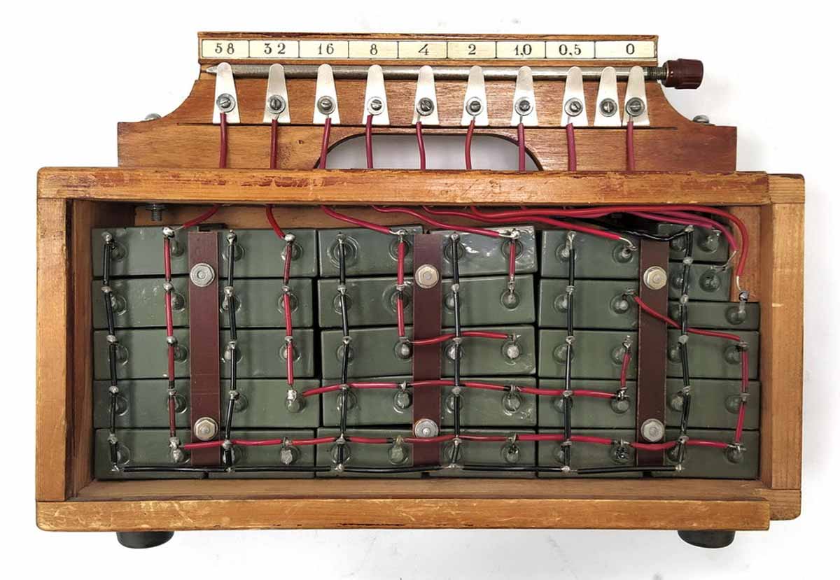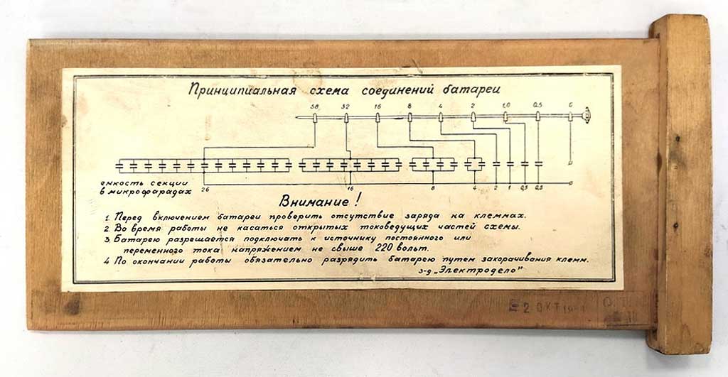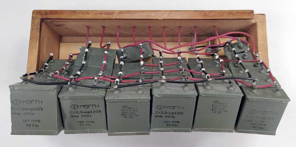 Батарея конденсаторов. Завод "Электродело", город Ленинград, 1959 год. Материалы "Юного Техника" взятые мной с форума https://rt20.getbb.ru/ из раздела "Коллекционеры".