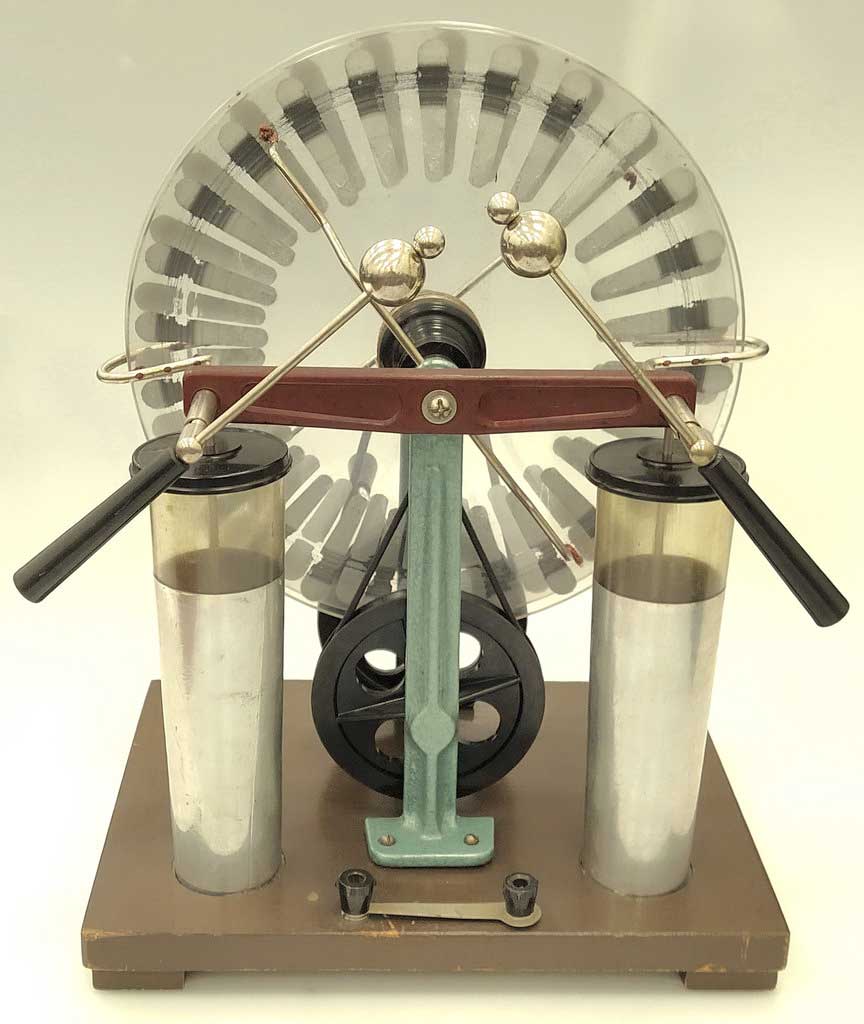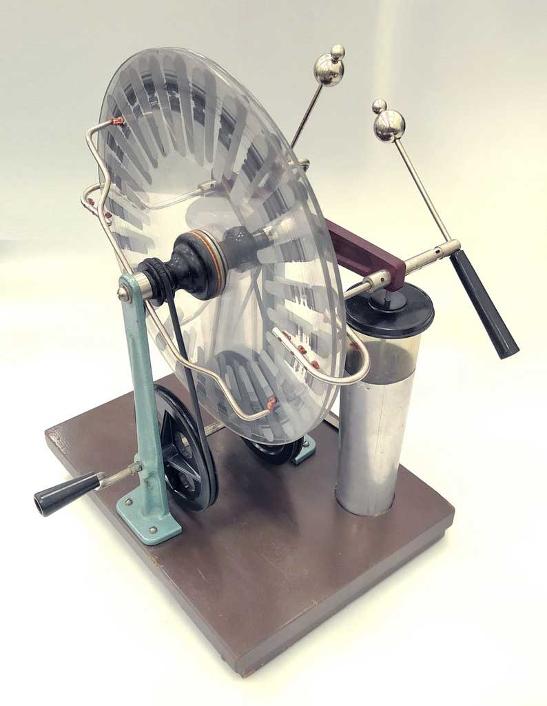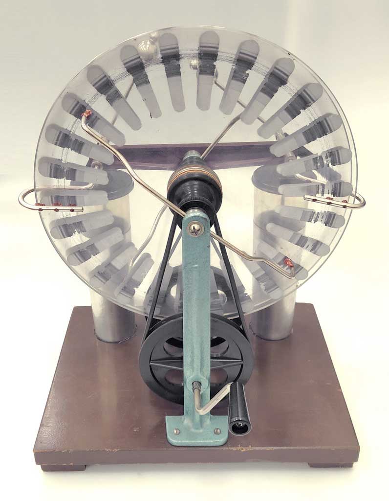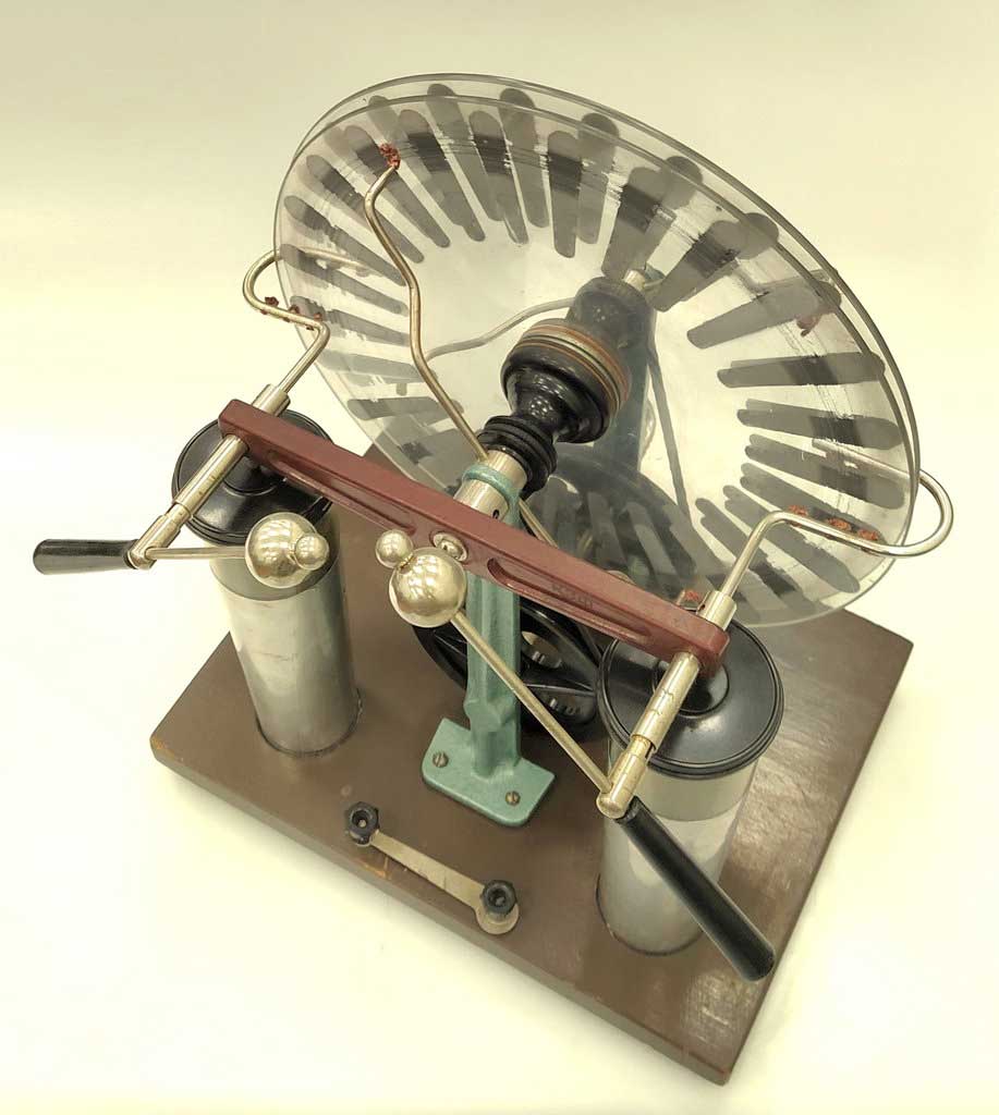 Электрофорная машина, или генератор Уимсхёрста (или Вимшурста). Предположительно изготовлена в городе Кирове в 1969 году. Википедия.