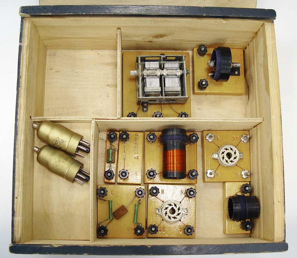 Набор по радиотехнике выпускался возможно с 1957 года Московским заводом "Физэлектроприбор". Несколько схем ламповых приёмников.