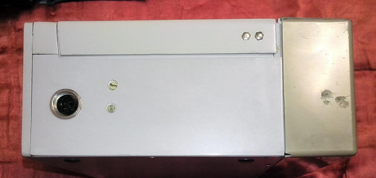 в светло-сером металлическом корпусе с поднимающейся вверх крышкой; на
