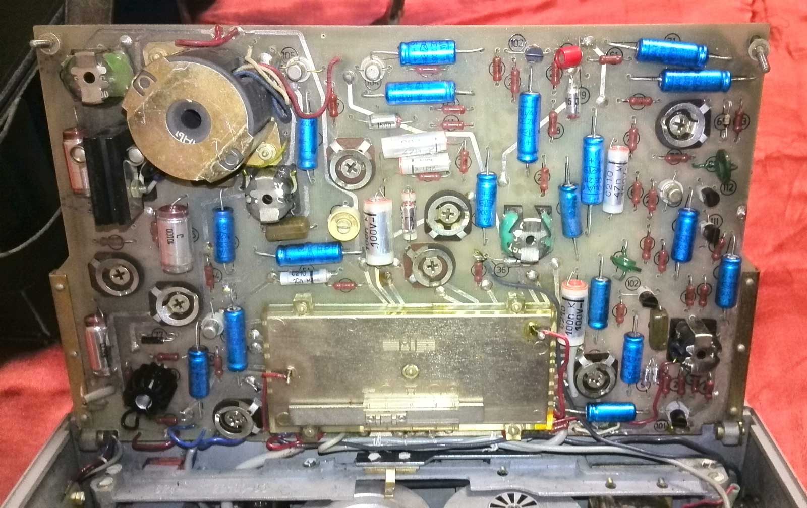 магнитофон в кожаном чехле с замочками и ремнём для переноски; в боковом