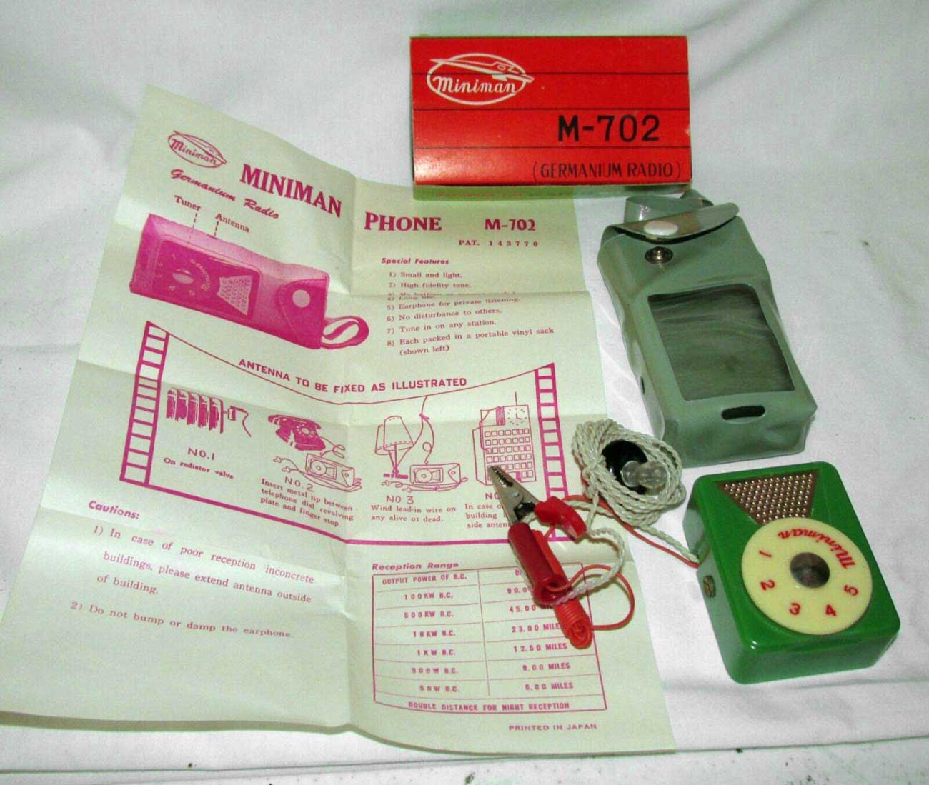Карманный детекторный радиоприёмник "Miniman M-702" выпускался ~ с 1960 года компанией "Miniman Industry", Япония. Позволяет принимать радиостанции в диапазоне СВ, на расстоянии до 50 километров.