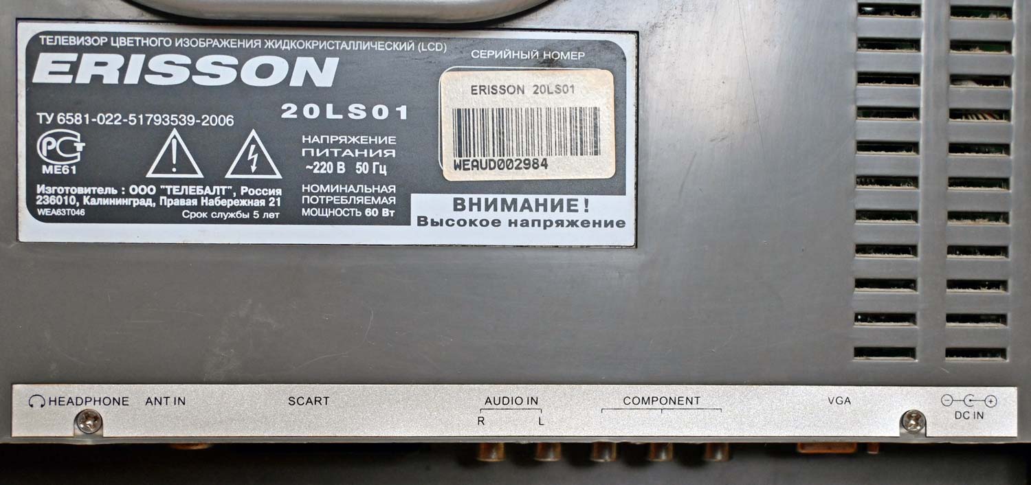 диагональю 20 дюймов и форматом 4:3. Год выпуска 2008. Изготовитель: калининградский