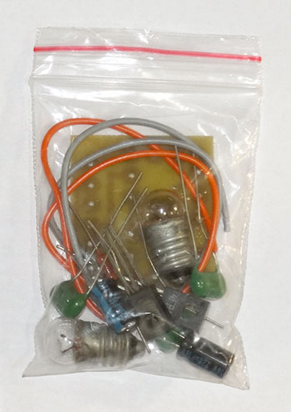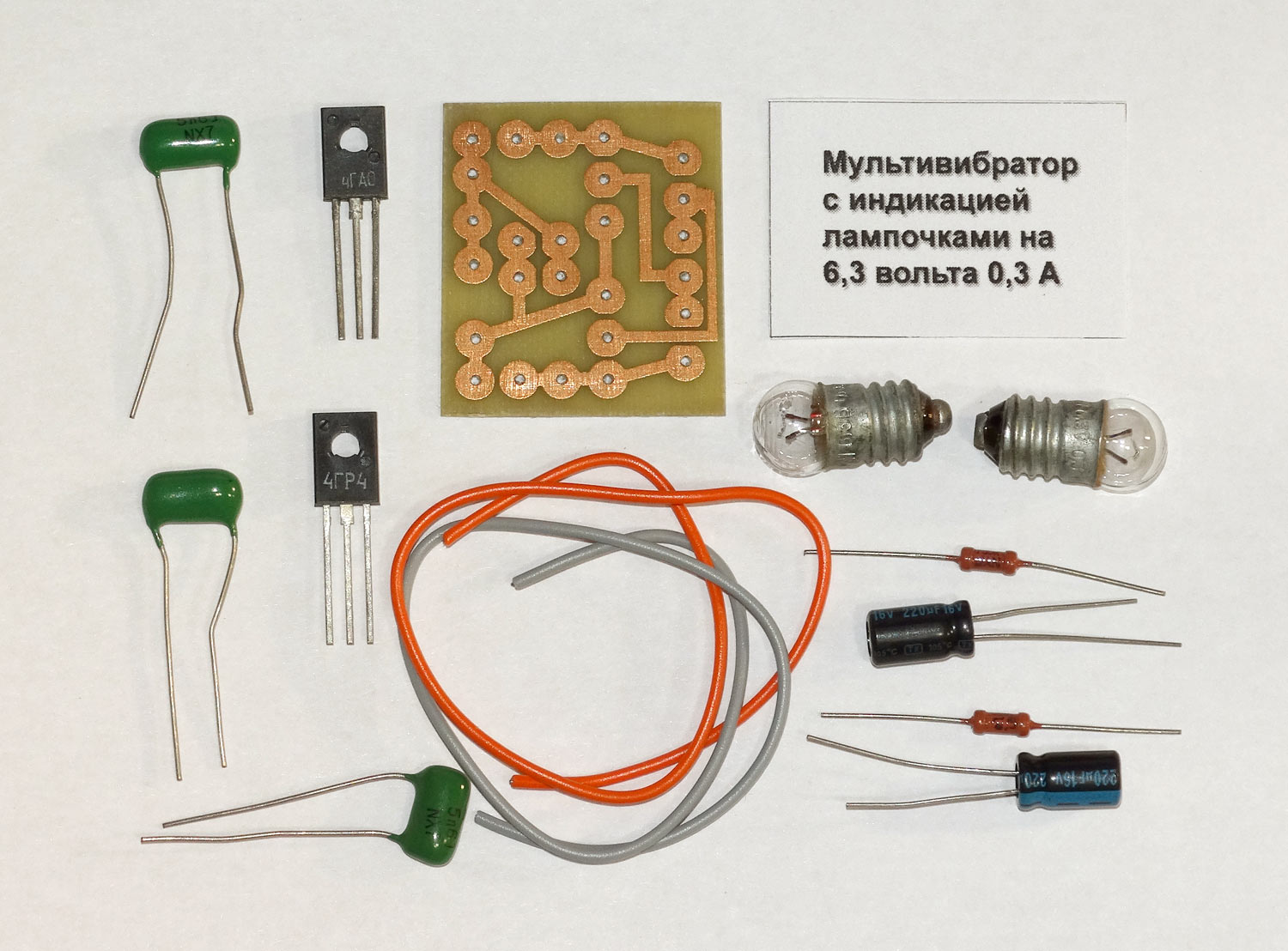 и монтажную схемы, детали и плату для сборки мультивибратора на двух транзисторах
