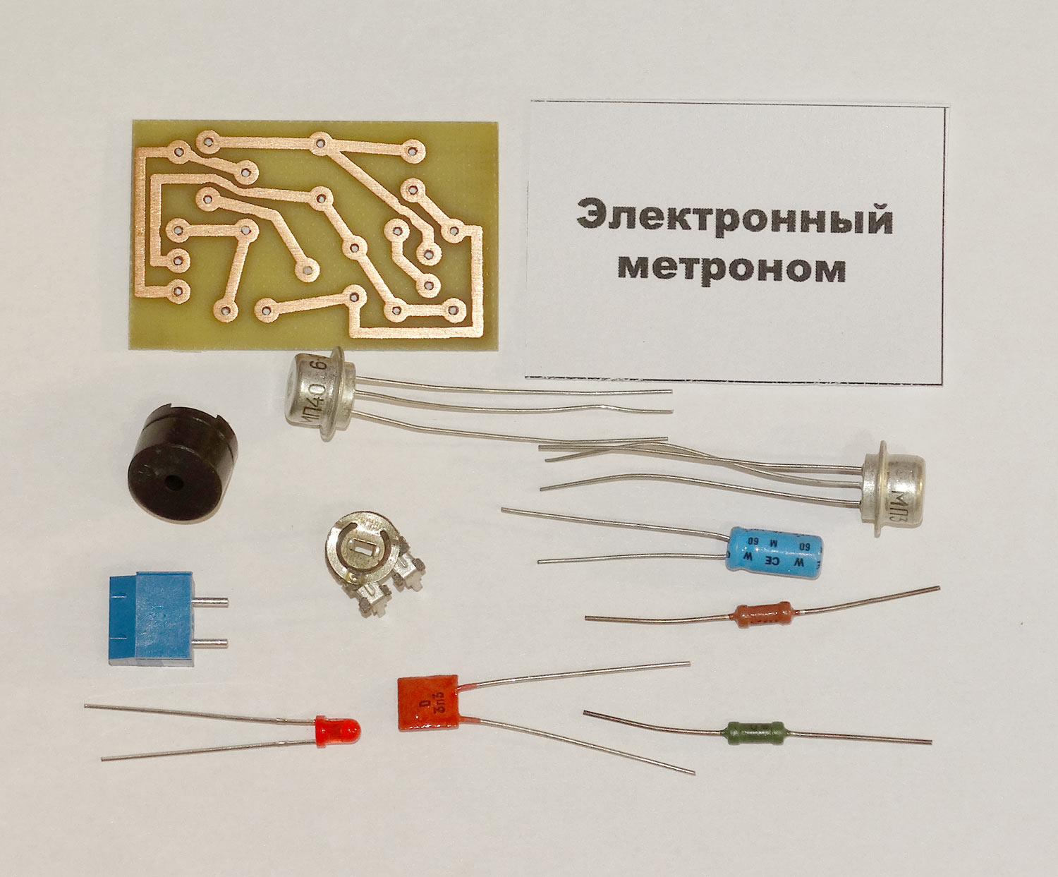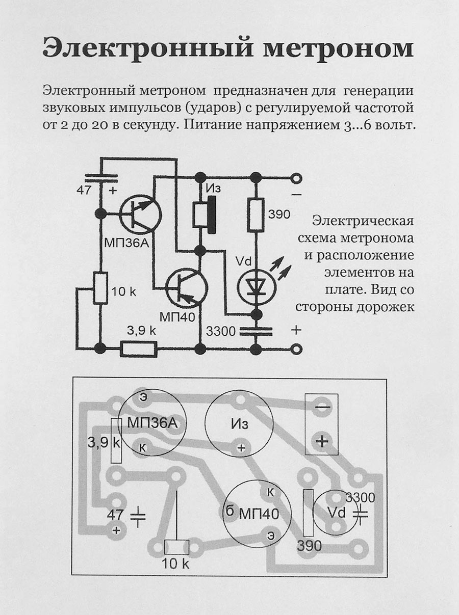 и монтажную схемы, радиодетали и плату для сборки электронного метронома,