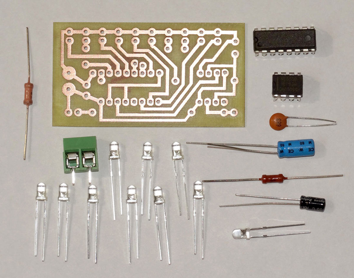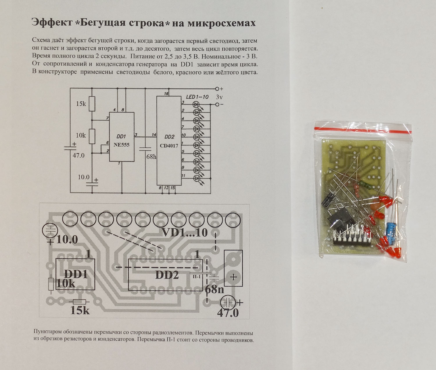 электрическую и монтажную схемы, радиодетали и плату для сборки схемы с