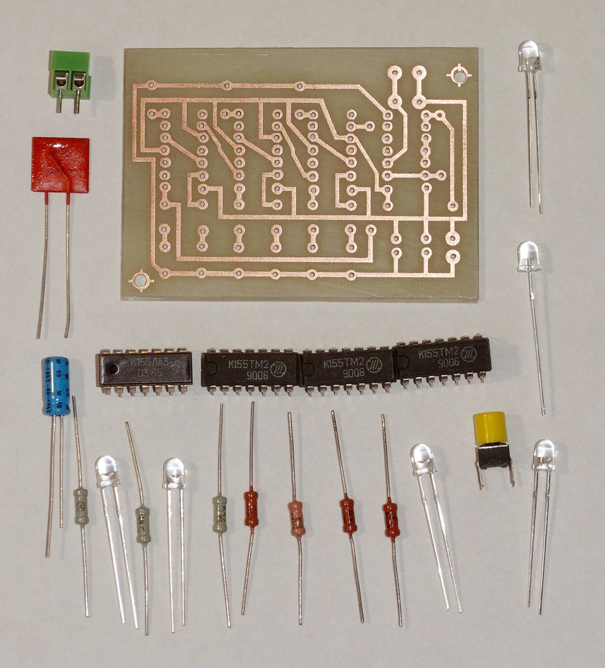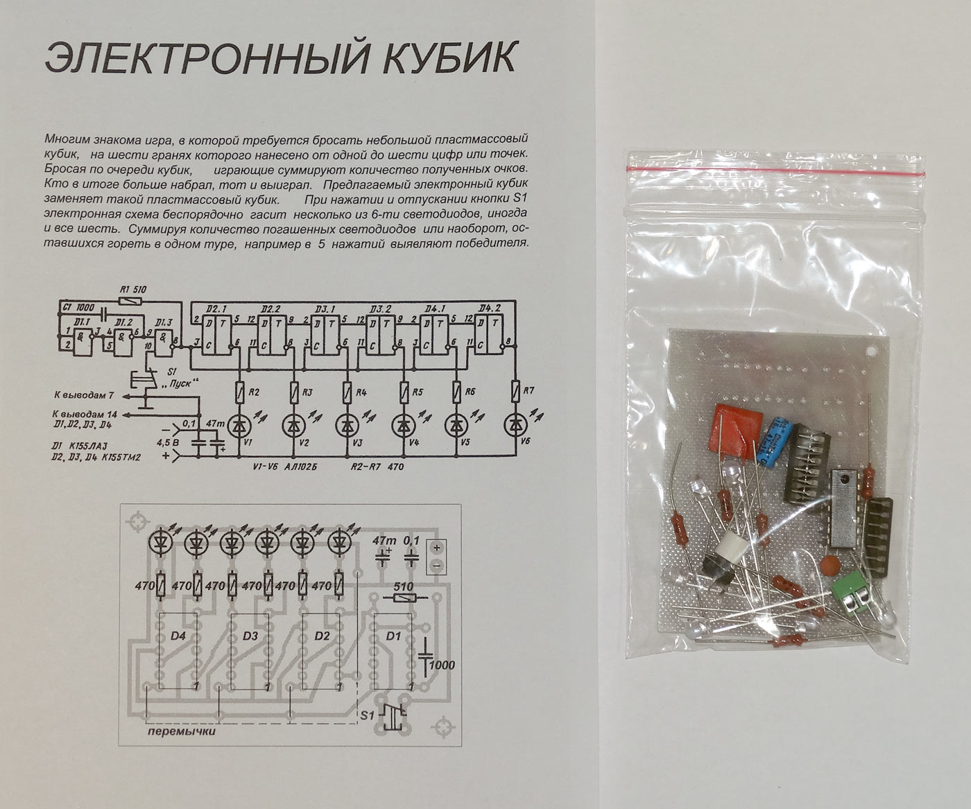электрическую и монтажную схемы, радиодетали и плату для сборки игры "Электронный