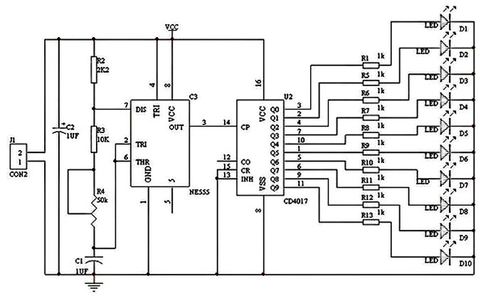 и гаснет первый, второй и так далее до десятого светодиода, затем с той