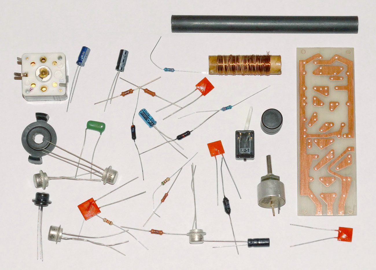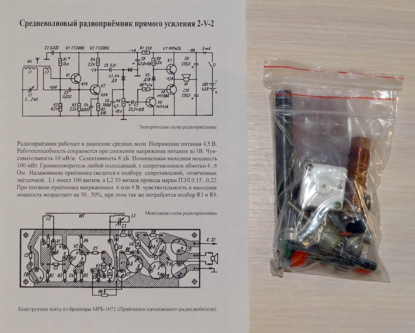 схемами, радиодетали и печатную плату для сборки СВ радиоприёмника прямого