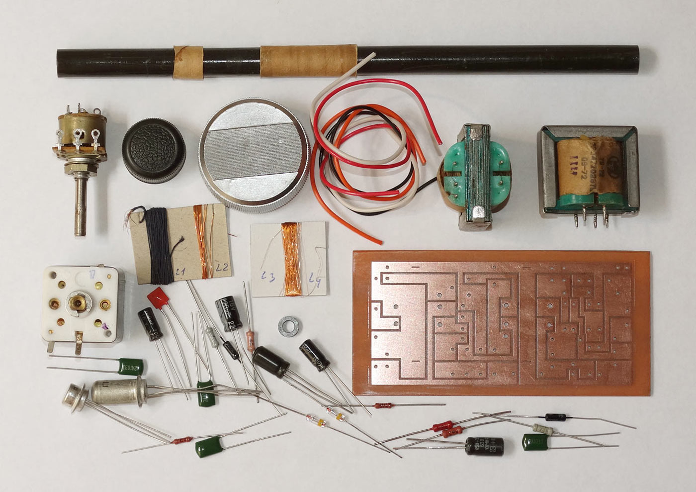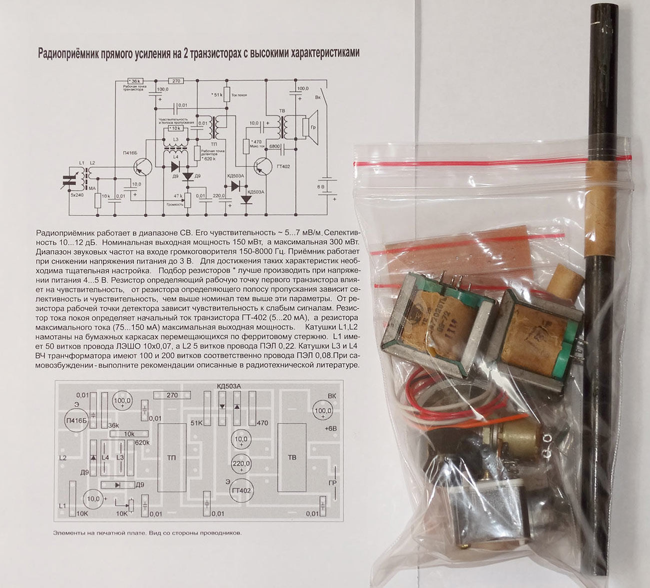 с электрической и монтажной схемами, радиодетали, печатная плата и комплектующие