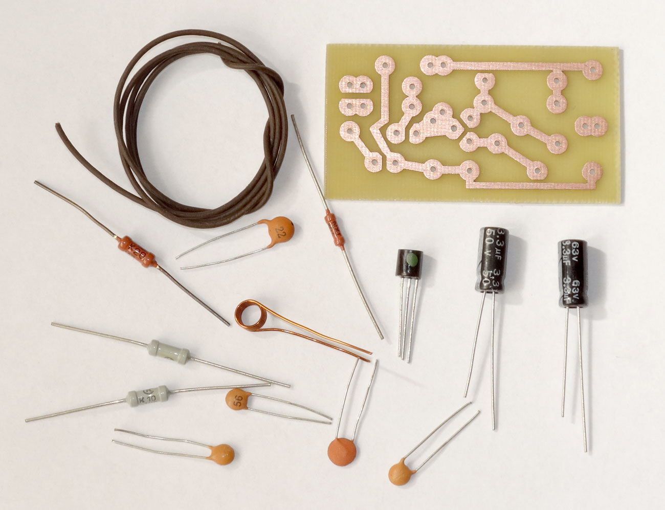электрическую и монтажную схемы, детали и печатную плату для сборки маломощного
