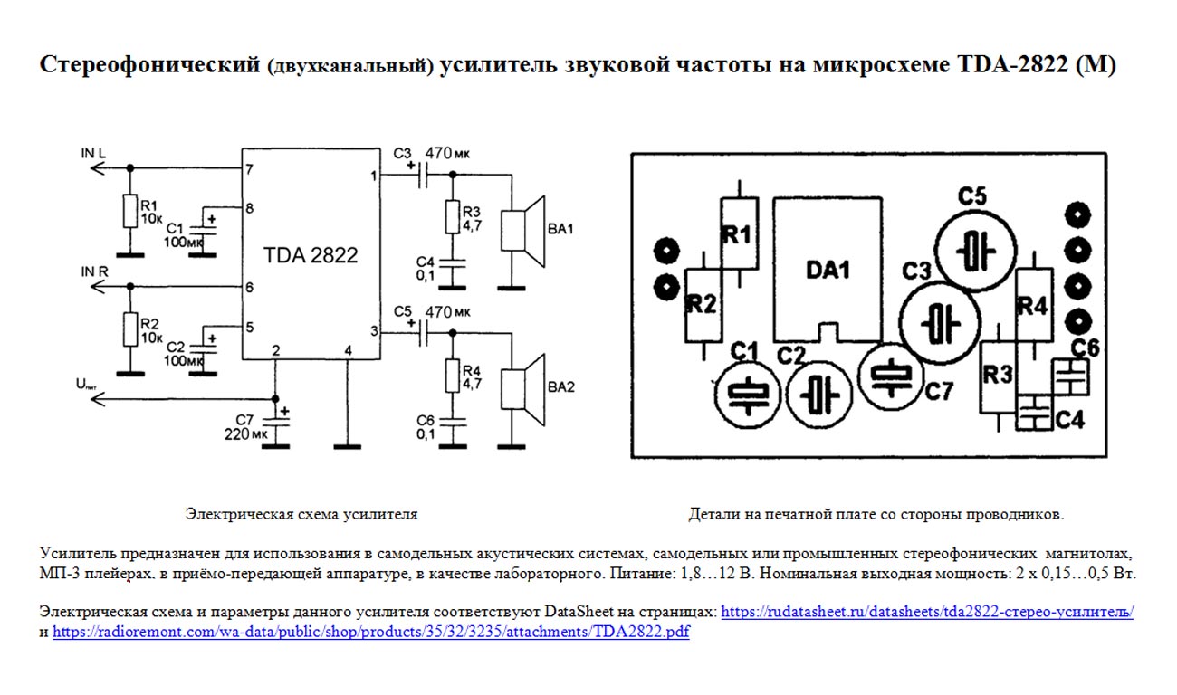 усилитель звуковой частоты на микросхеме TDA-2822 (M)".