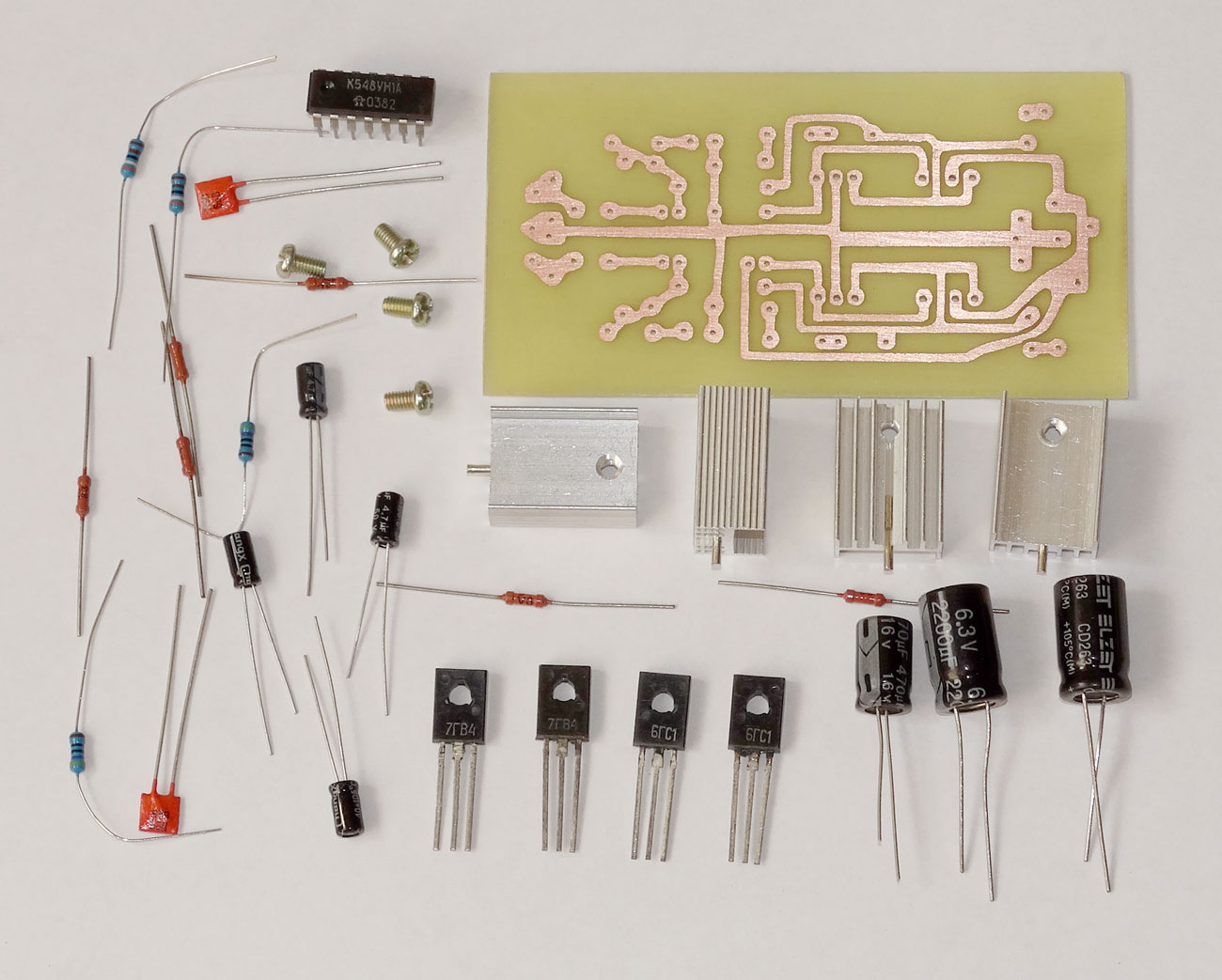 описание, схемы, радиодетали, радиаторы и печатную плату для сборки усилителя