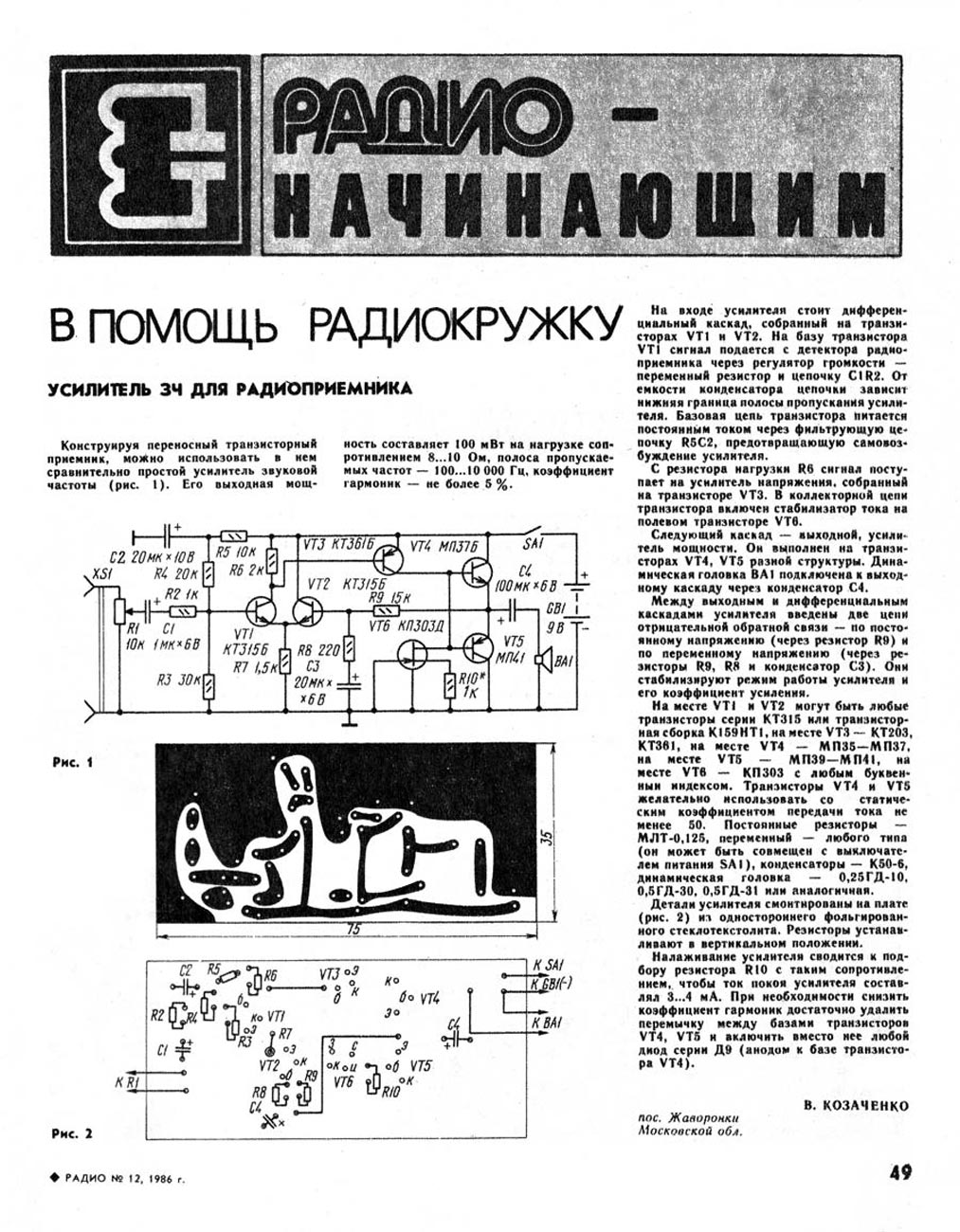 (Радио №12 за 1986 г.) содержит описание, схемы, радиодетали и печатную