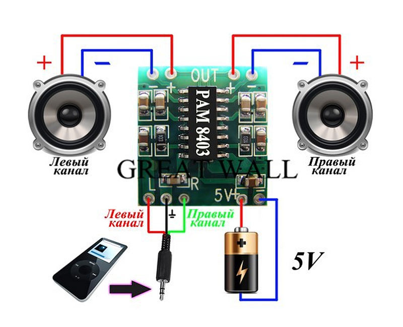 смартфоном, MP3 плейером и т.д. Класс "D". Питание 5 вольт (хорошо работает
