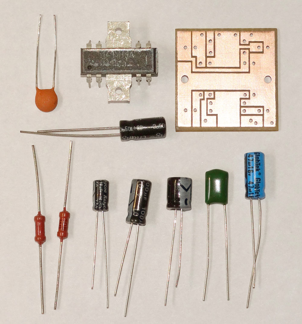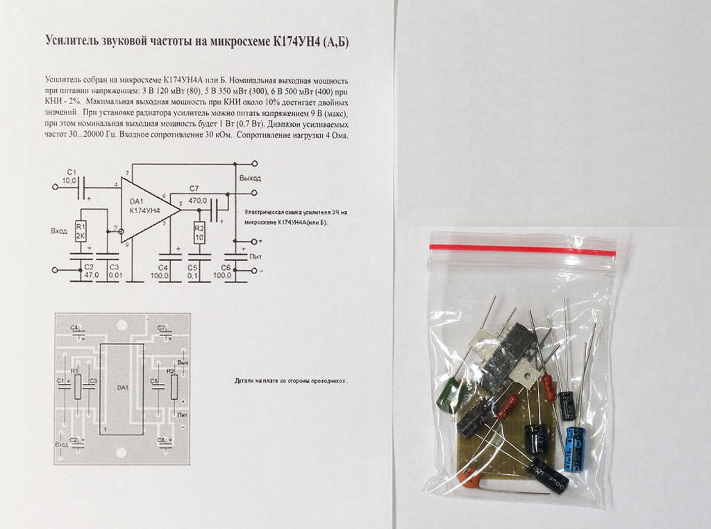электрическую и монтажную схемы, радиодетали и печатную плату для сборки