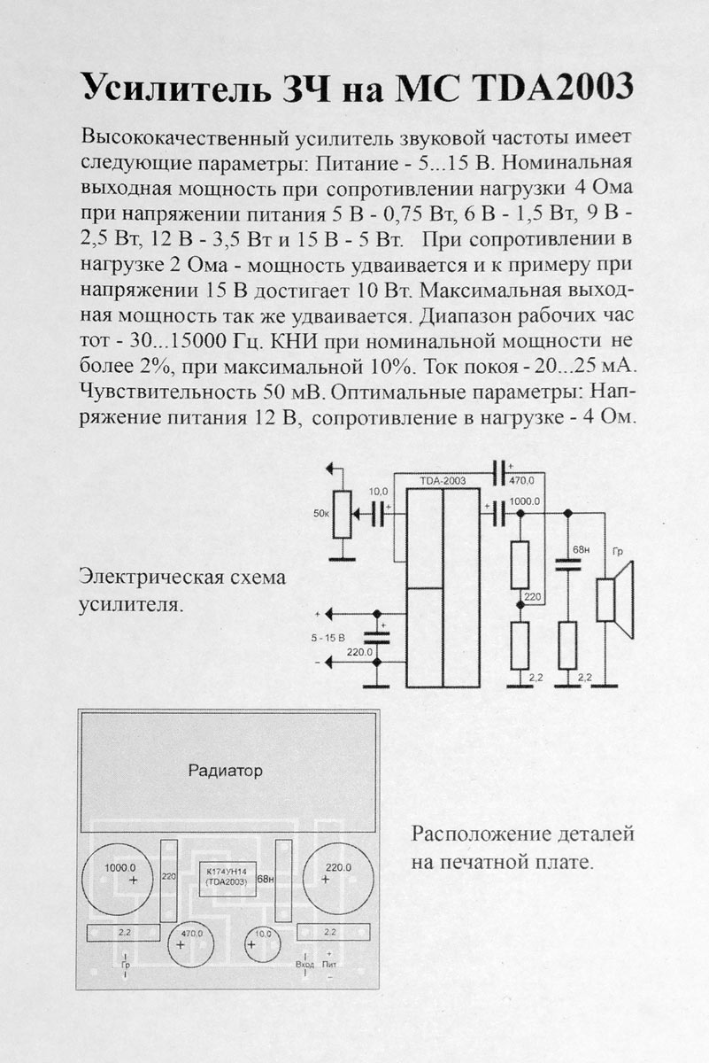 напряжение питания 12...15 В, сопротивление в нагрузке 4 Ом. Диапазон рабочих